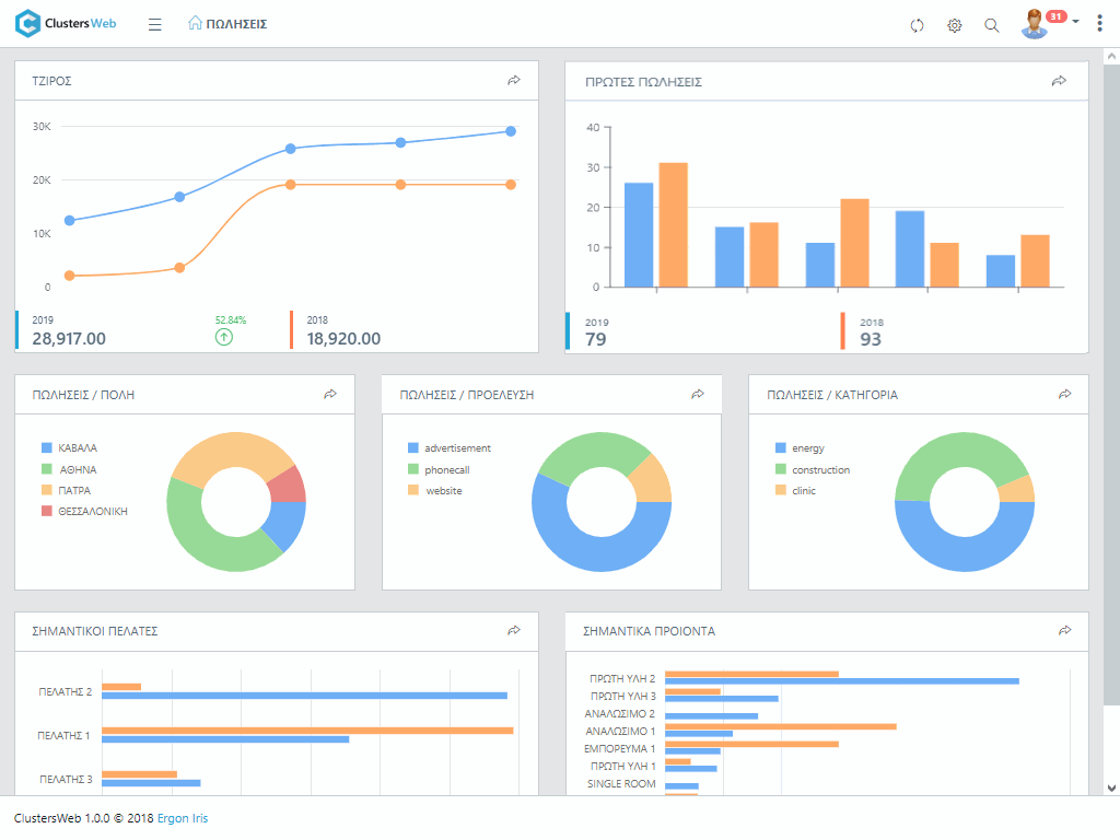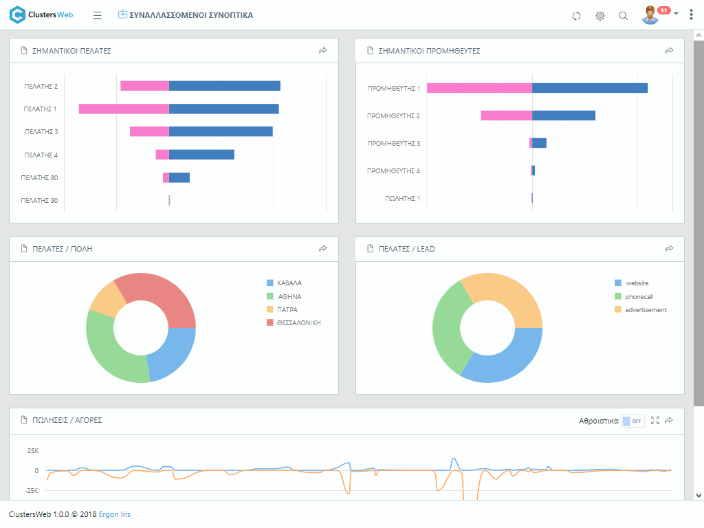 Συνδυάστε διαφορετικά δεδομένα ERP, CRM, BPM και Data Analytics κάτω από μια μοναδική ομπρέλα στο cloud για να ελέγχετε απόλυτα τη ροή των δραστηριοτήτων σας στο σύνολο της. Το Clusters καλύπτει πλήρως τις ανάγκες σας σε οικονομική, εμπορική και λογιστική διαχείριση, όπως και σε κοστολόγηση, παραγωγή και διαχείριση Αποθηκών.