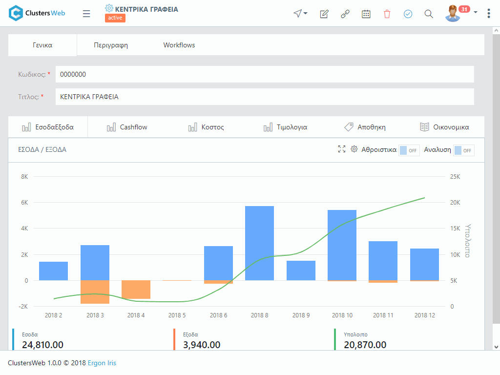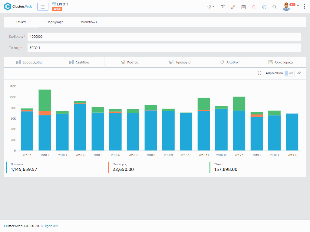 Το Clusters Cloud ανταποκρίνεται πλήρως στις απαιτήσεις του πελάτη. Με την 3D Coding Τεχνολογία του επιτρέπει την καταχώρηση και την παρακολούθηση των οικονομικών στοιχείων κατά έργο και τμήμα του έργου. Με την τεχνολογία των workflows, το σύστημα δίνει τη δυνατότητα εισαγωγής δράσεων που αφορούν το έργο, όπως αυτοψία, πρόβλημα, ραντεβού, κ.ο.κ. και παρακολούθησης του ιστορικού της εξέλιξής τους. Παρέχει ακόμη τη δυνατότητα προσθήκης εγγράφων, φωτογραφιών και οποιωνδήποτε άλλων αρχείων που αφορούν το έργο. Με το module Project Management οι χρήστες μπορούν να καταχωρούν δομημένους προϋπολογισμούς, για την αξιακή και χρονική παρακολούθηση των έργων. Όλες οι οικονομικες πληροφορίες ενημερώνουν αυτόματα και το λογιστήριο για πλήρη λογιστική παρακολούθηση είτε κατά έργο είτε και για το σύνολο της εταιρείας.